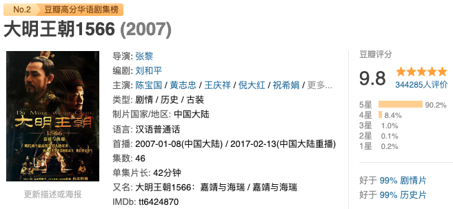 《大明王朝1566》由张黎执导,刘和平编剧,于2007年播出。由陈宝国 / 黄志忠 / 王庆祥 / 倪大红 等实力派演员主演,豆瓣评分高达9.8分。